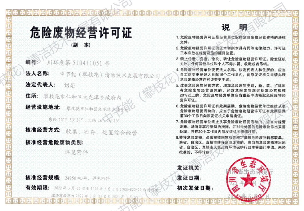 中節(jié)能(攀枝花)清潔技術(shù)發(fā)展有限公司(以下簡(jiǎn)稱公司)成立于2008年5月,注冊(cè)資金1.6519億元。公司由中節(jié)能清潔技術(shù)發(fā)展有限公司和攀枝花市產(chǎn)業(yè)投資經(jīng)營(yíng)有限責(zé)任公司共同持股,并由中節(jié)能清潔技術(shù)發(fā)展有限公司控股經(jīng)營(yíng)。公司投資建設(shè)和運(yùn)營(yíng)的攀枝花市危險(xiǎn)廢物處置中心項(xiàng)目是全國(guó)統(tǒng)籌部署的全國(guó)31個(gè)危險(xiǎn)廢物綜合處置中心項(xiàng)目之一,位于攀枝花市仁和區(qū)大龍?zhí)多l(xiāng)迤資村華賣(mài)社,核準(zhǔn)處理原生廢物2.425萬(wàn)噸/年,可對(duì)43大類,447項(xiàng)(醫(yī)療廢物)進(jìn)行安全處置。
